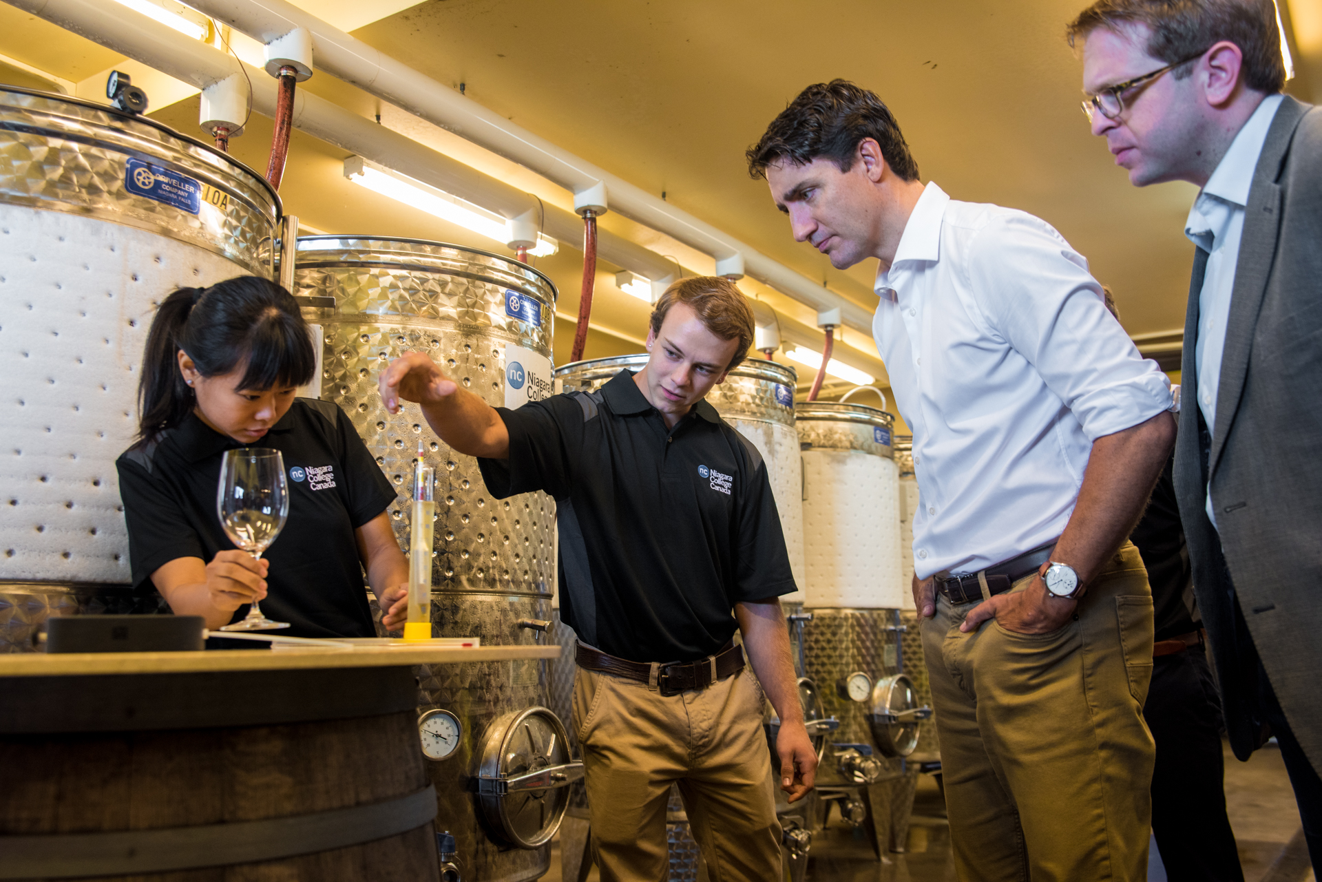 While touring the Niagara College Teaching Winery, the Prime Minister met Kalem Magny of Fenwick, ON, a current student in Niagara College’s Winery and Viticulture Technician program, and Di Yao, originally of Fuzhou Province, China, a recent graduate of the Winery and Viticulture Technician program currently working at Jackson-Triggs Winery, who, along with Niagara College winemaker/professor Gavin Robertson, demonstrated winemaking processes.