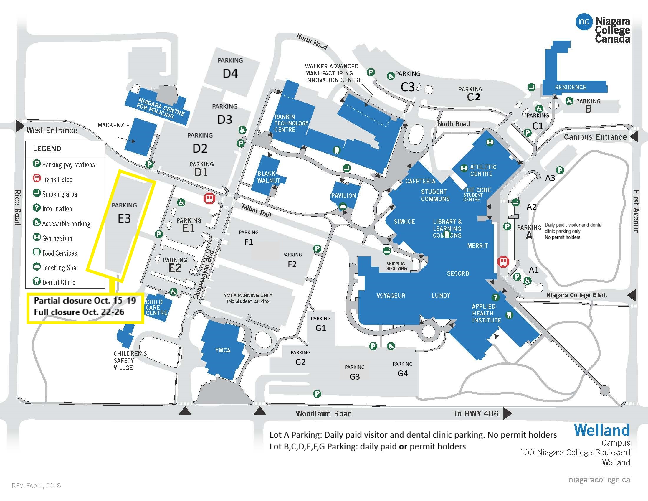 Niagara College is continuing to improve parking availability at both NC campuses. Beginning Oct. 13, Parking Lot E3 at the Welland Campus (gravel lot near the Rice Road entrance) will be paved and painted. These improvements are meant to improve the efficiency of the lot and are expected to add approximately 50 new spaces.