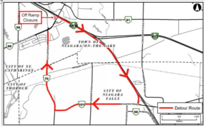 - The QEW Niagara Bound off-ramp will be closed at Glendale Avenue. Traffic will be diverted via a detour route through Taylor Road and Mountain Road.