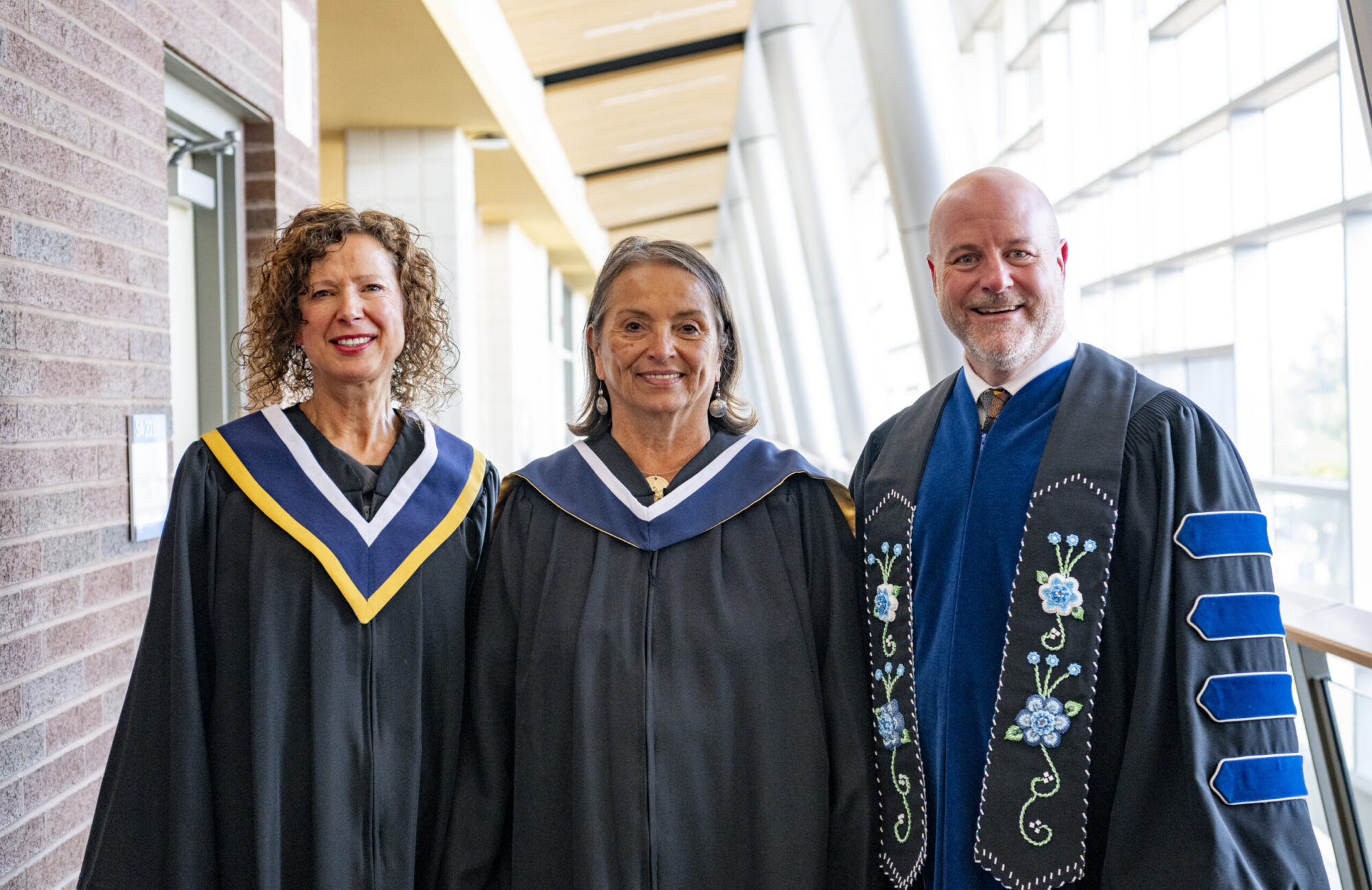 In addition to conferring an honorary degree upon Jamieson, NC also presented her with a Haudenosaunee-style raised beadwork stole and the Strong Water Singers – an Indigenous drumming collective – performed an honour song for Jamieson.