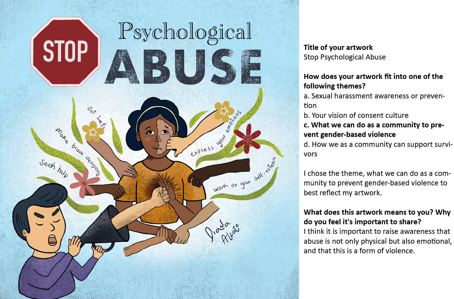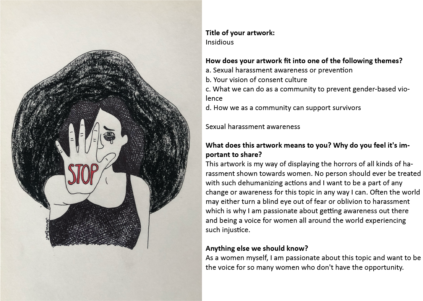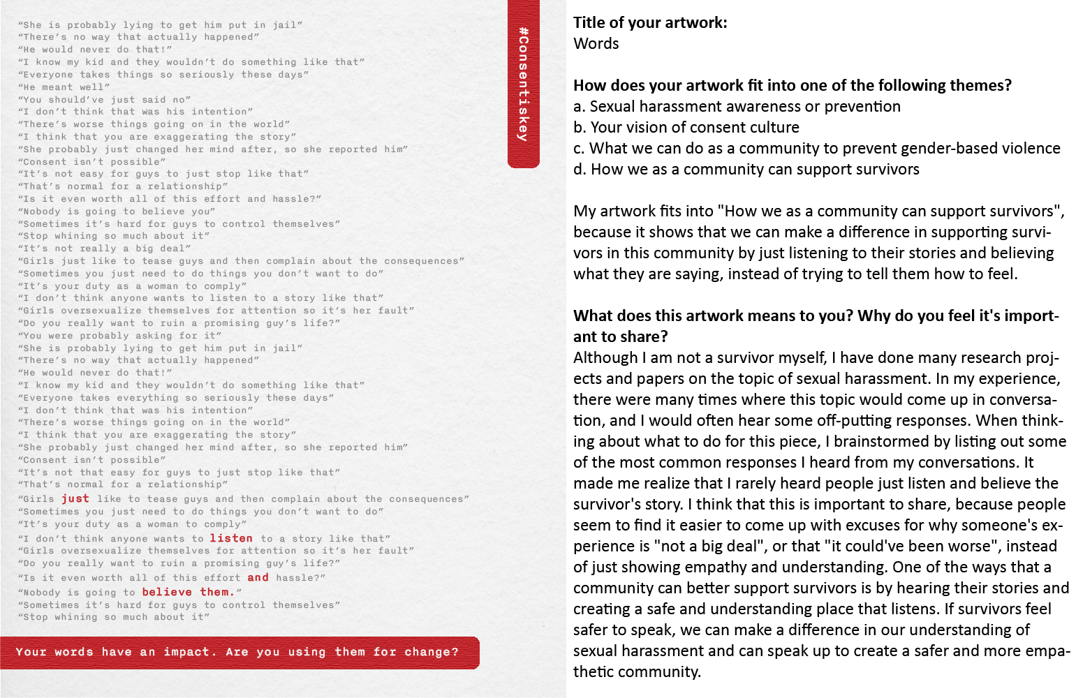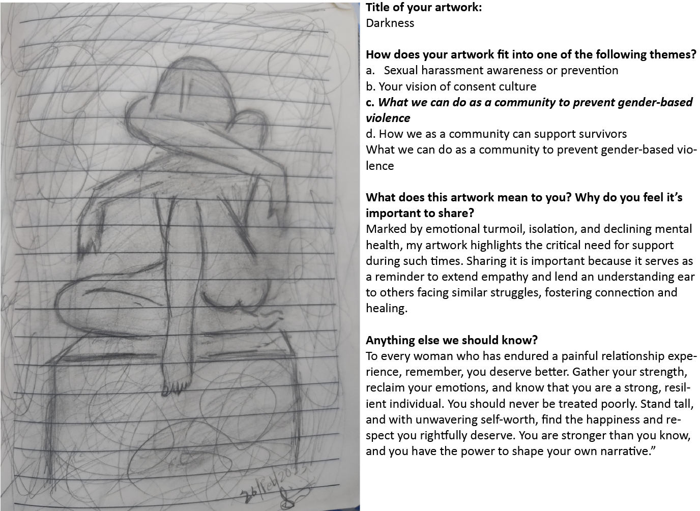 The Consent is Key Art Contest received submissions until November 30, 2023. From the entries, five winners were chosen and awarded $100 gift cards. Their artwork may be featured in future Consent is Key campaigns. All mediums of artwork were encouraged and pieces were required to be related to one of the contest themes.