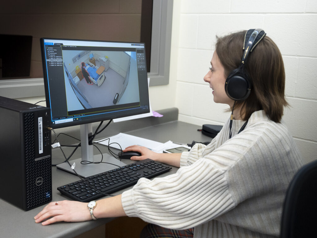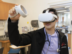 By wearing an Oculus headset and using hand controllers, research participants can look at the patient – a sim in the College’s nursing lab – to see if they need nursing, medical or medication interventions and accomplish positive clinical outcomes like better breathing, use of virtual oxygen or the administration of a virtual medication.