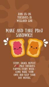 It’s PB&J o’clock 🥪 Every Tuesday, drop in, make a sandwich, and take a well-deserved break between classes. In room L201 Welland Campus