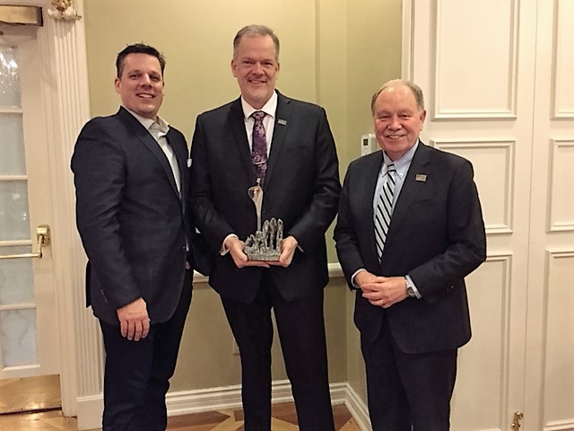 CFWI dean Craig Youdale (middle) stands with NC president Dan Patterson (right) and previous Celia Liu award recipient and the vice chair of the Niagara College Board of Governors Del Rollo at the Spirit of Niagara Awards.