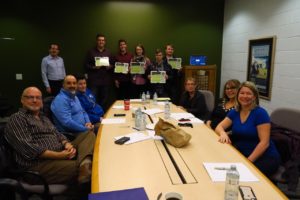 BRTF students (holding certificates from left) Eric VonHunnis, Ethan Carson, Heather Eaton, Jake Rice, and Tim Williamson) are pictured with BGCN board members at a meeting February 28. Among BGCN board members pictured is Rob Walters (standing, left), NC’s special advisor to Dan Patterson.