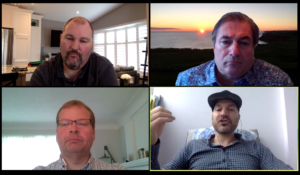 Professors join Mark Montefiore (bottom right) in a Zoom webinar including (clockwise from top left) Dutch VandenBerg, Tom Otto, and Bruce Gillbert (bottom left).