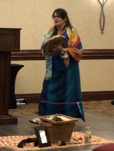 NPAAMB team member and instructor Cindilee Ecker-Flagg is pictured singing/drumming a closing ceremony song in honour of the graduates on August 19.