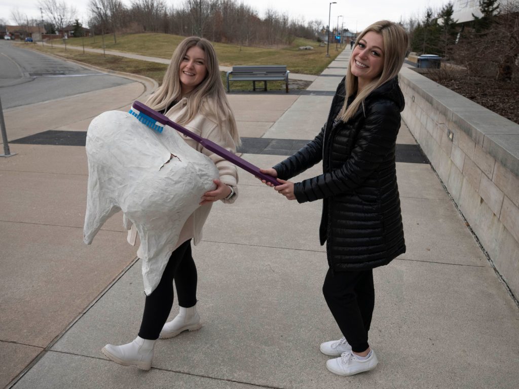 Dental Hygiene student Ashley Klaver holds the ‘toothbrush’ while Madison Page holds the ‘tooth.’