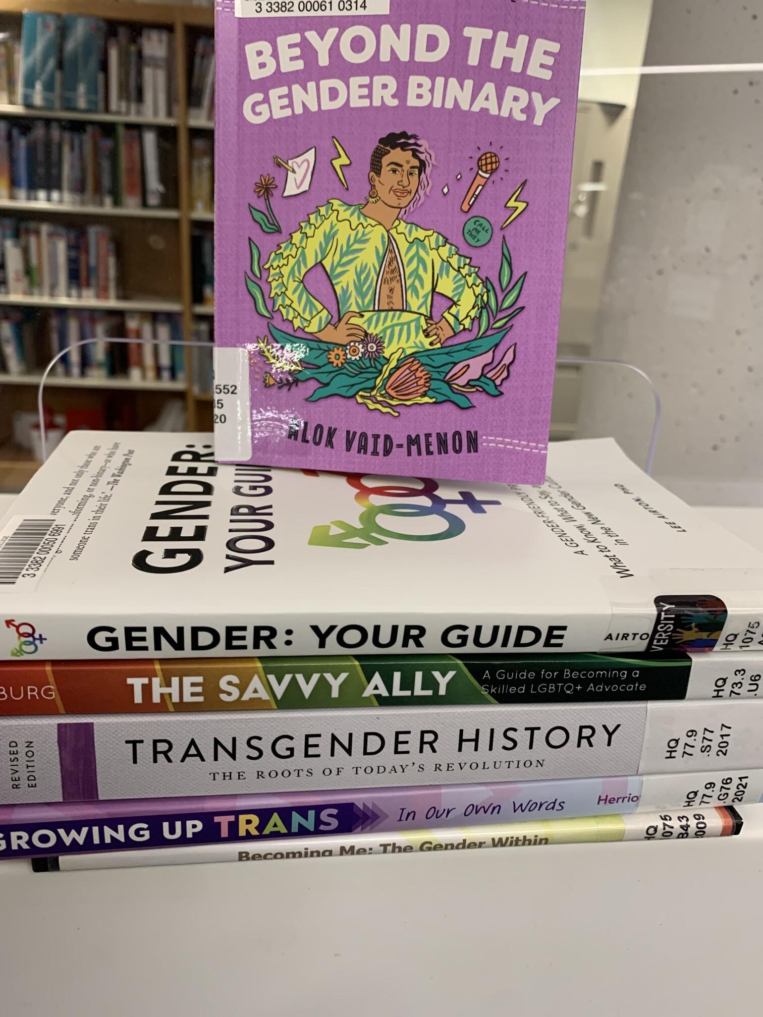 A book collection on 2SLGBTQIA+ topics on display at the Welland Campus library.