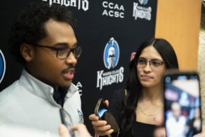 Laura Guiot listens to Knights men’s basketball assistant coach Lequan Hylton.