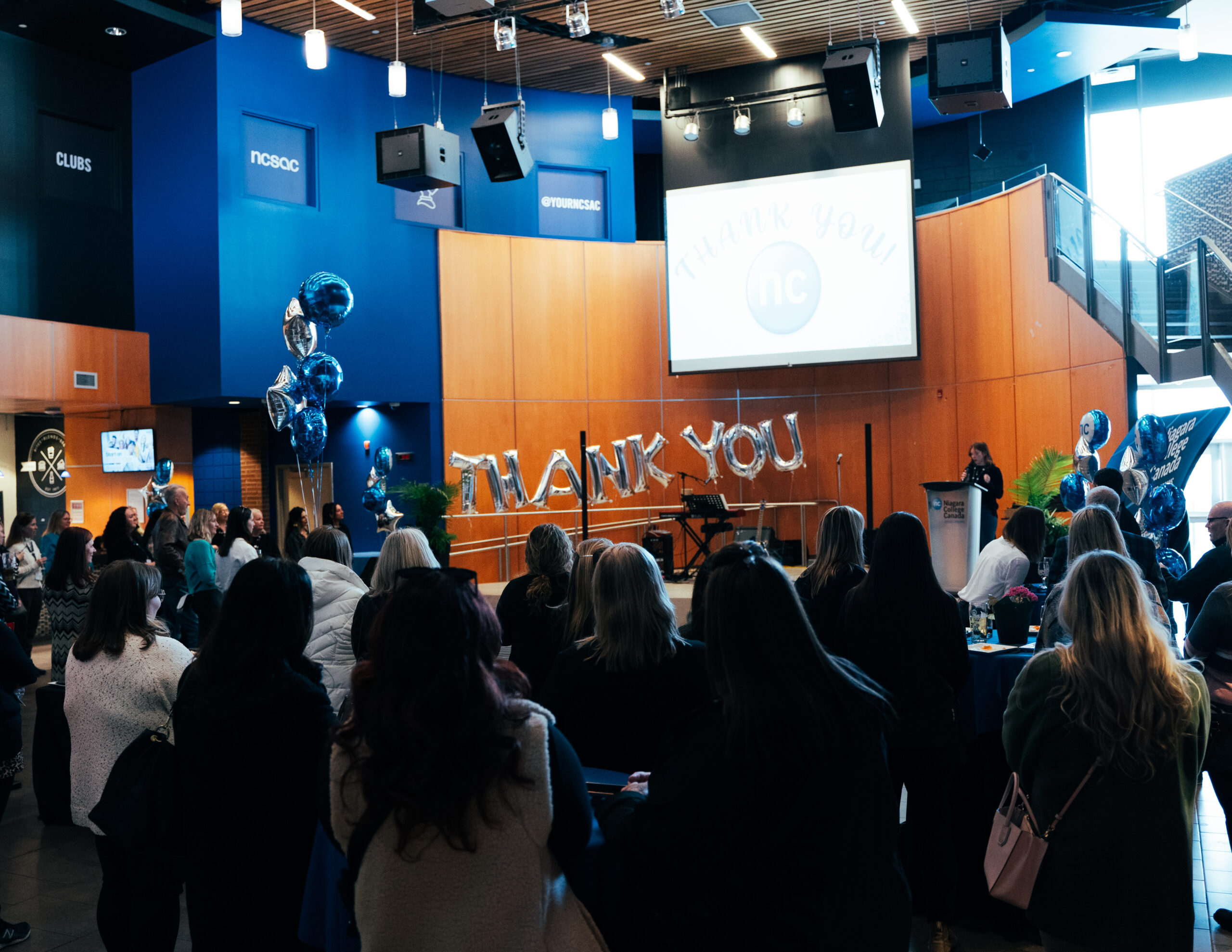 Six current Recreation Therapy, Social Service Worker, Child and Youth Care, Educational Assistant, Adult Support, and Autism & Behavioural Science students took to the stage to say a few words of thanks to those who helped them in their respective fields as internship employers and PAC members. Each student wore a name tag with a flag from their home country to highlight how proud NC is to have students from all around the world.