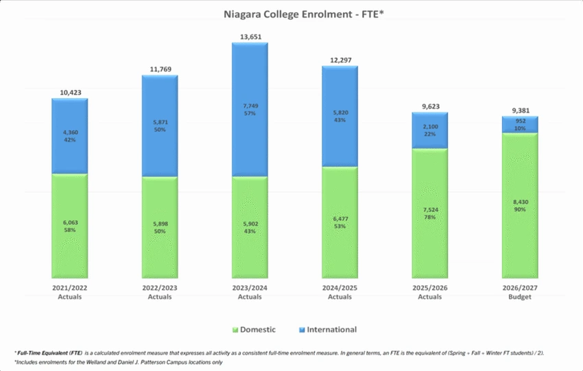 Broad policy changes at the federal level continue to cause significant changes to postsecondary enrolments nationwide, and Niagara College is not immune. Our collective efforts and strategic investments in marketing and recruitment are bearing fruit on the domestic side – we are among the fastest-growing colleges in the province domestically, and all signs point to our highest-ever domestic intake in the year ahead. The difference in international enrolments, however, is stark, as illustrated below. While international students made up more than half of our total enrolment just three years ago, they will constitute only 10 percent of our overall enrolment in 2026-2027.