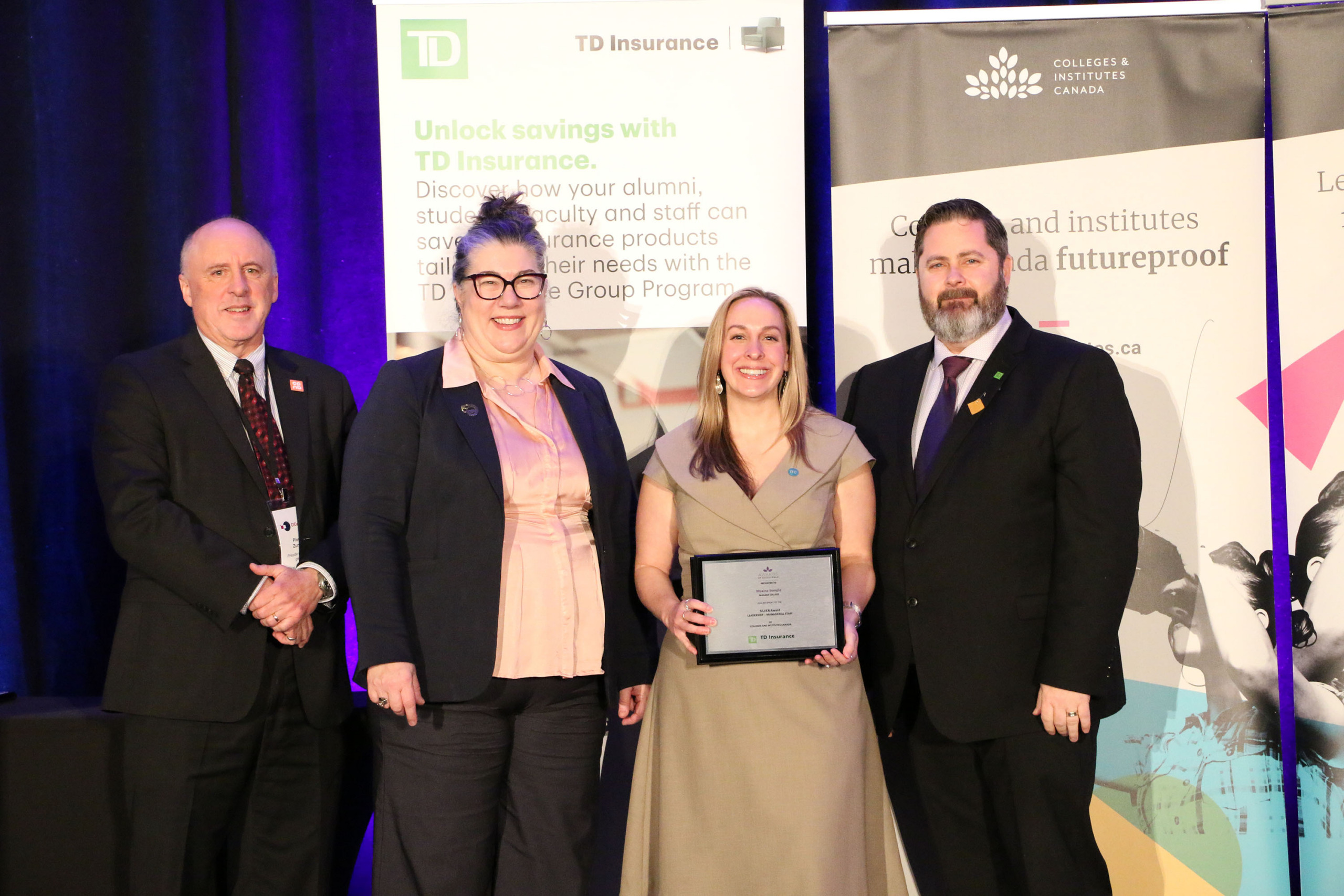 Semple (middle right) receives her award from CICan on April 23. Others L-R: Pierre Zundel, President and CEO, Collège communautaire du Nouveau-Brunswick (CCNB) and Chair of the CICan Board of Directors; Pari Johnston, President and CEO, CICan; Steve Laurin, Vice President, Affinity Market Group, TD Insurance. Photo credit: CICan